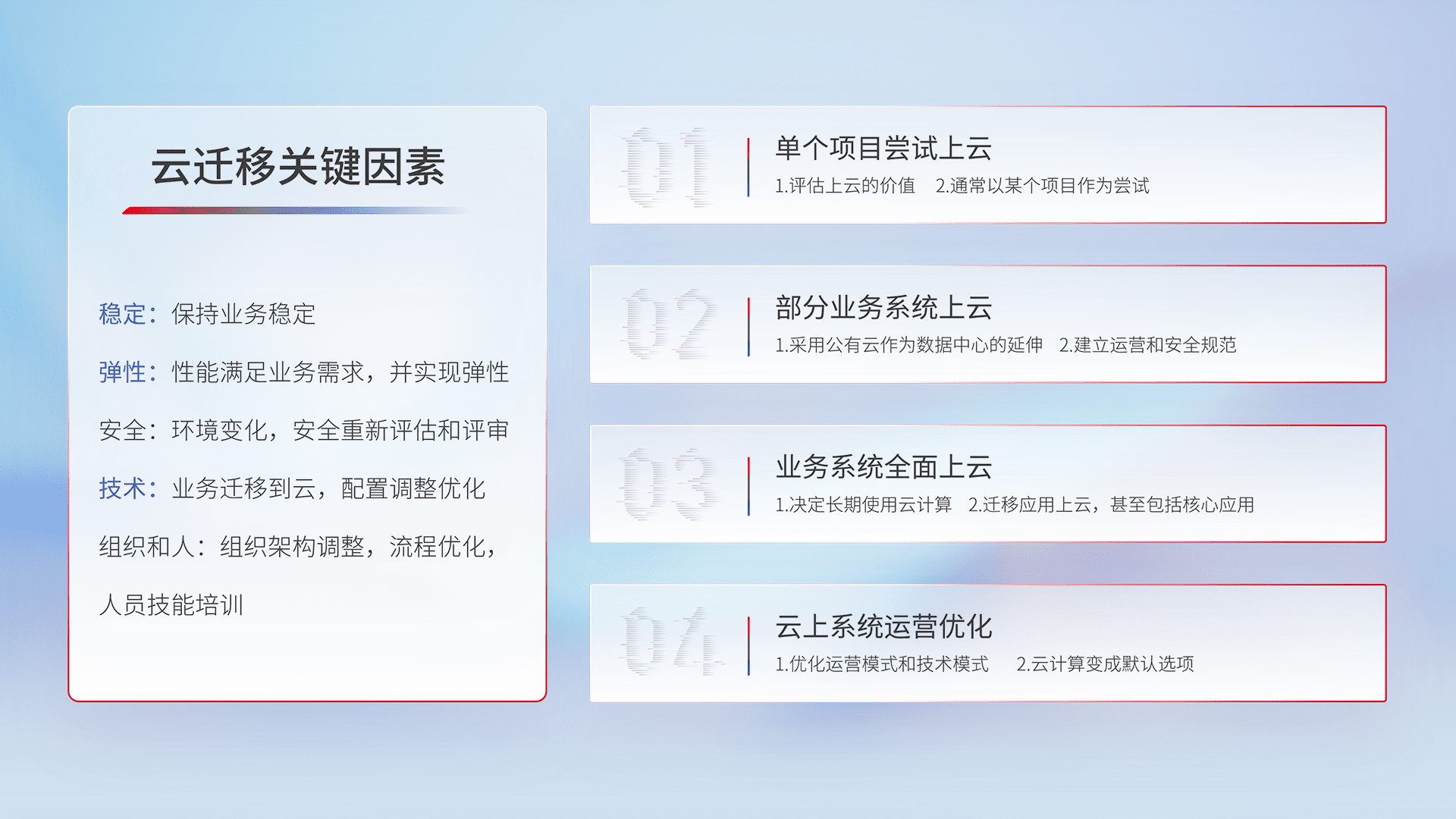 结合实际业务,,从规划设计、、云平台选型、、、、云原生改造、、、数据迁移、、、集成交付,,迁移全过程为客户识别最佳上云路径,,,,做好风险识别管理,,,设计网络架构、、、、身份权限、、、、安全审计合规、、操作审计、、日志审计、、、、监控告警策略、、、多站点容灾设计等,,对云上基础设施进行整体规划,,提升IT治理水平,,,以满足弹性、、、、高可用、、、、高性能的需求。。。
