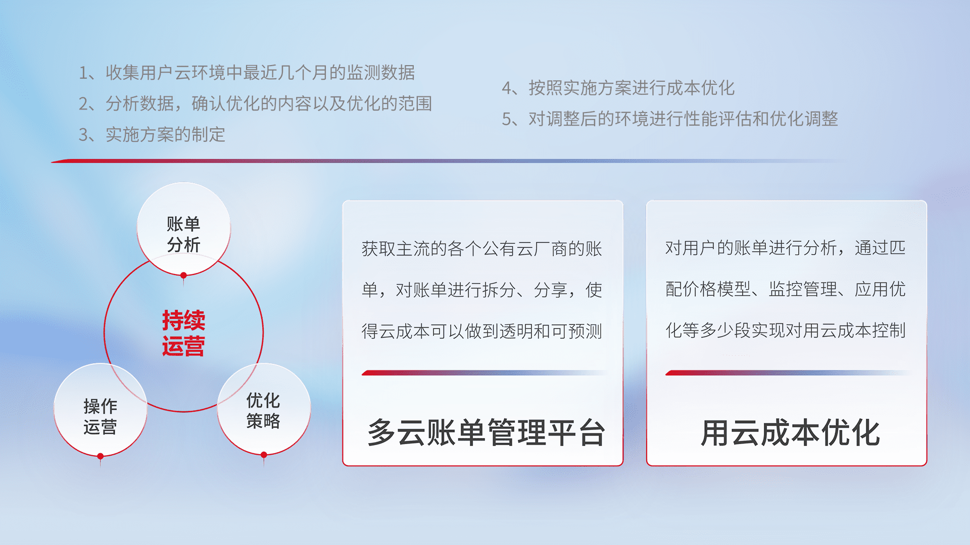 通过多云纳管,,,,以统一的资源数据模型把客户的云资源进行抽象和封装,,进而实现对多云资源的统一操作,,,,保障云资源管理的可靠性、、稳定性与可用性。。量身定制化运维内容,,,配置、、开发运维、、、补丁管理、、、、备份、、、、监控、、认证和访问管理、、、审计和日常巡检等,,保障在用云过程中的可靠度,,,稳定度以及高可用率。。。